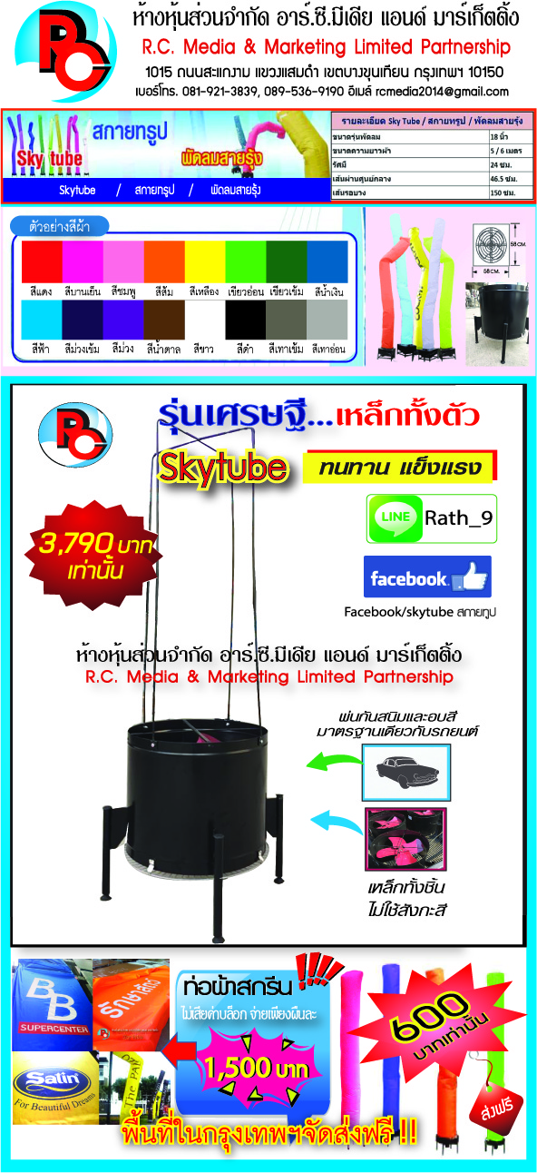 E-mail : rcmedia2014@gmail.com Website : www.rcmedia2014.com Facebook : www.facebook.com/Skytube-สกายทูป เปิดทำการ : ทุกวัน 8.00-20.00 น. ทุกวัน